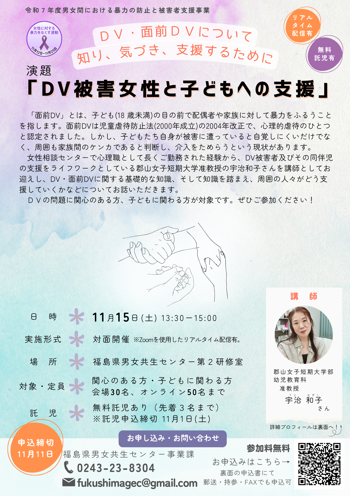 DV被害者及びその同伴児の支援をライフワークとしている郡山女子短期大学部幼児教育科の宇治和子さんをお迎えし、DV・面前DVに関する基礎的な知識、その支援の方法についてお話しいただきます。
