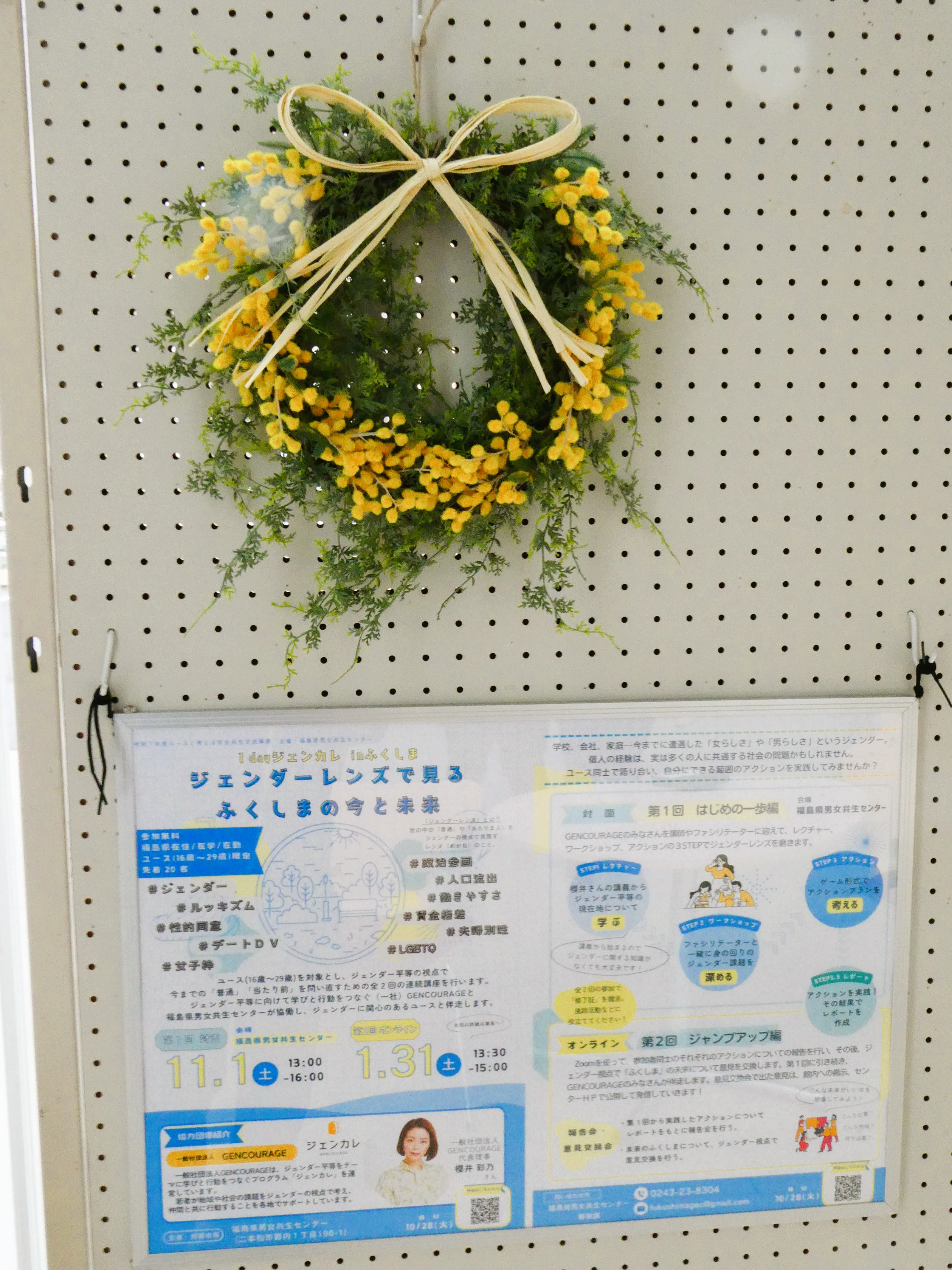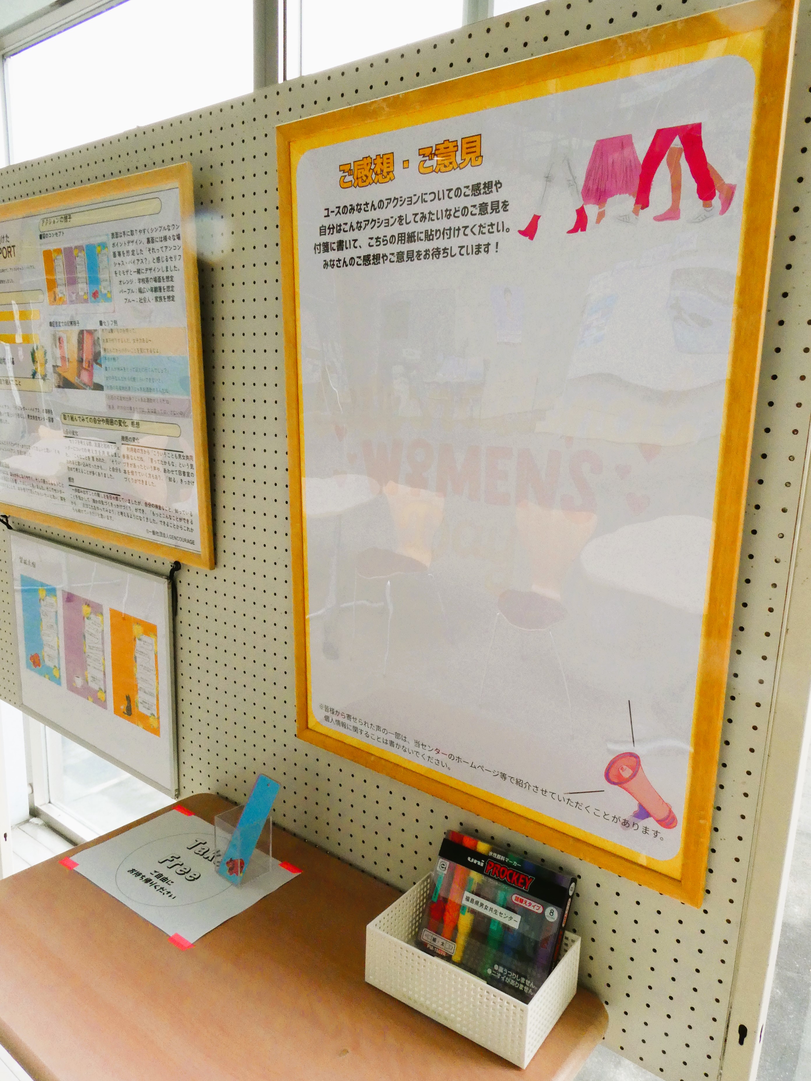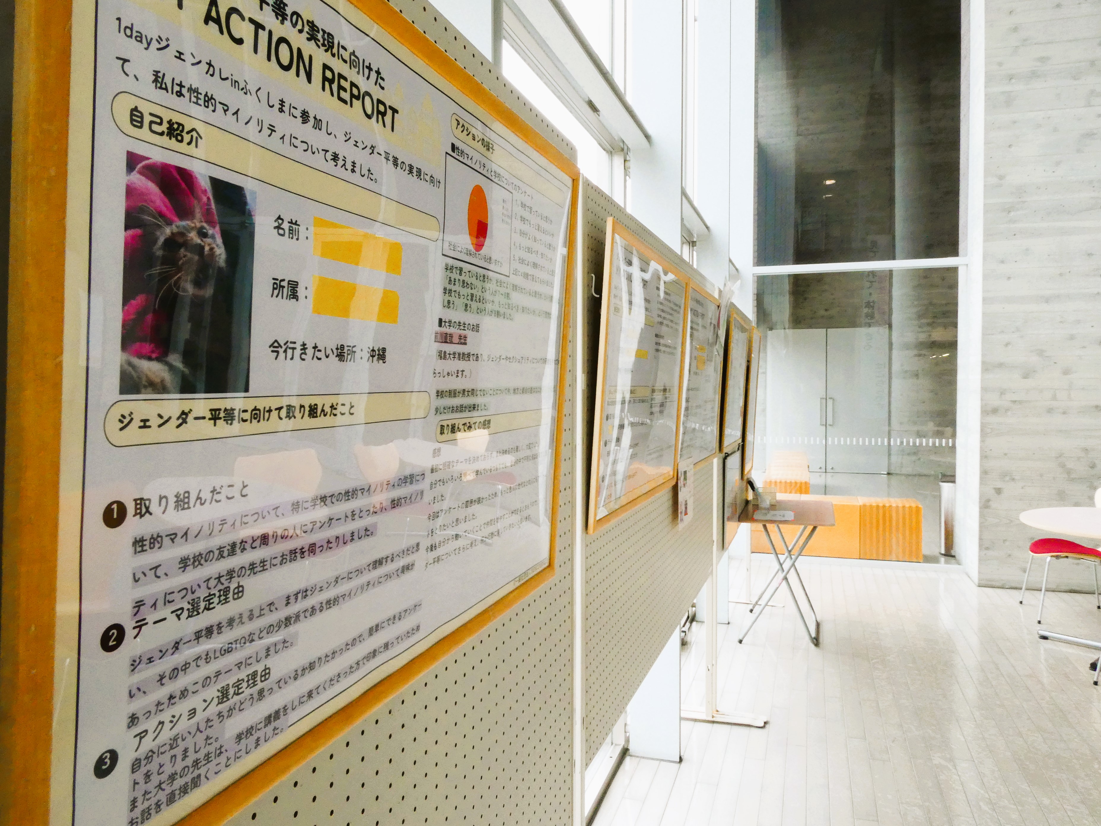「1dayジェンカレinふくしま」(講座報告はこちら!)に参加してくださった参加者の方が作成したアクションレポートをセンター1Fエントランスホールにて展示しております。